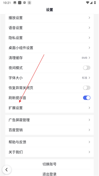 3、在设置界面里找到扩展设置选项并点击,进入扩展功能的配置页面。