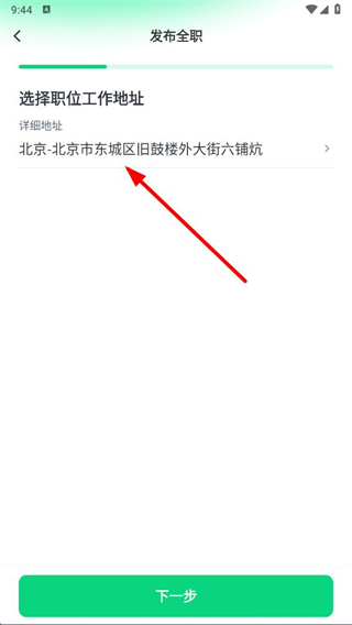 3、在发布全职页面选择职位工作地址,点击下一步。