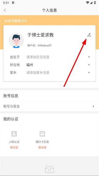 3、在个人信息页面点击昵称右侧的编辑图标,进入编辑个人资料页面。