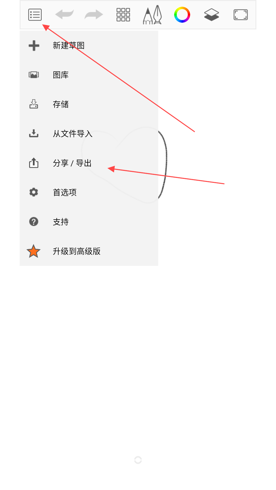 1、在Sketchbook软件中完成绘图后,点击界面上方的菜单图标,在弹出的下拉菜单中,点击分享/导出选项。