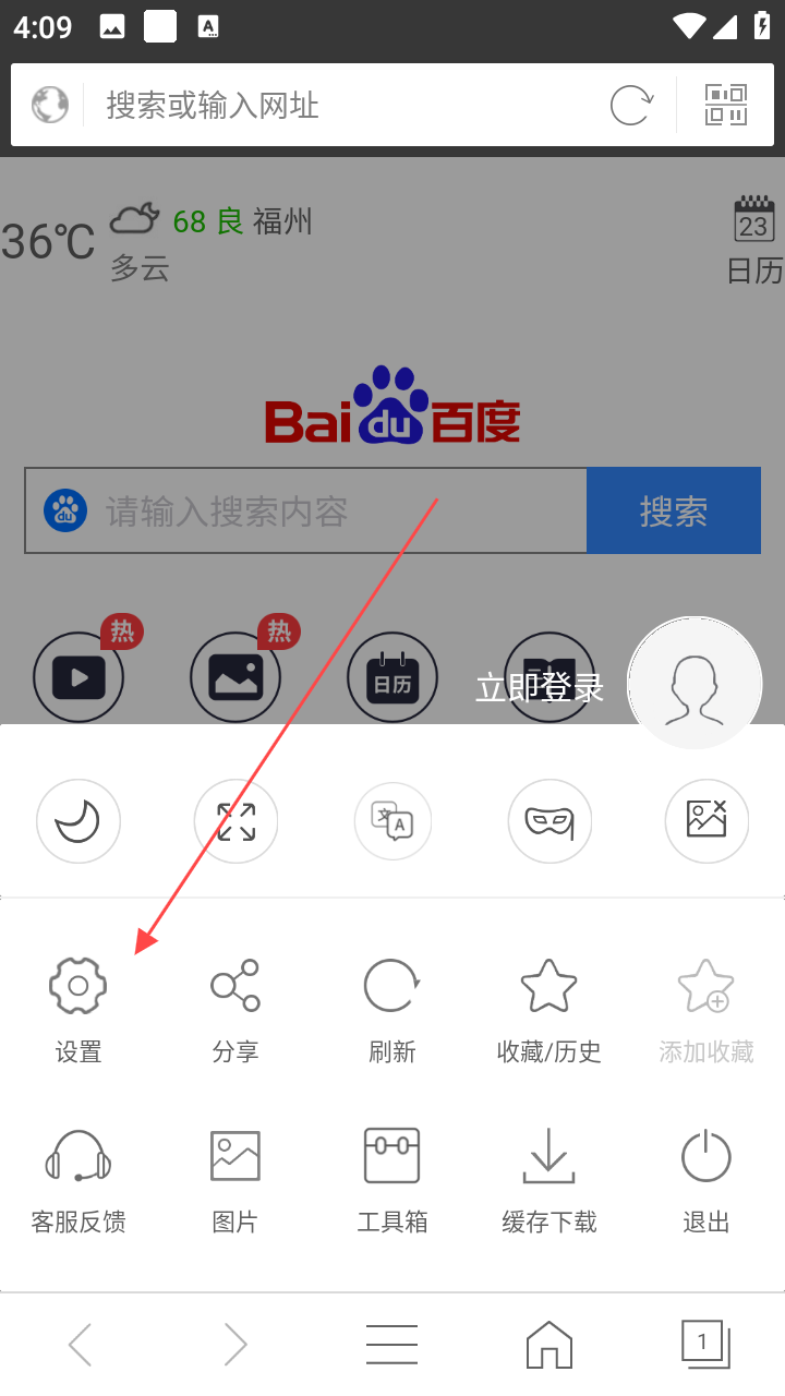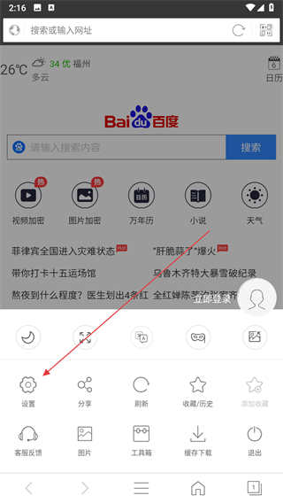 2、在功能列表中选择设置选项,进入浏览器的设置页面。