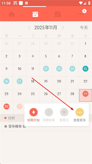 2、在日期选择页面选择目标日期,点击弹出菜单中的查看更多。