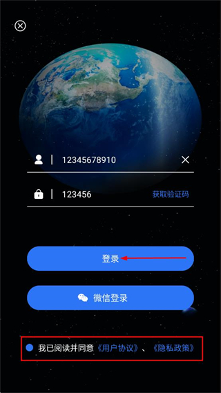 3、在登录界面填写手机号码,点击获取验证码并填入收到的内容。