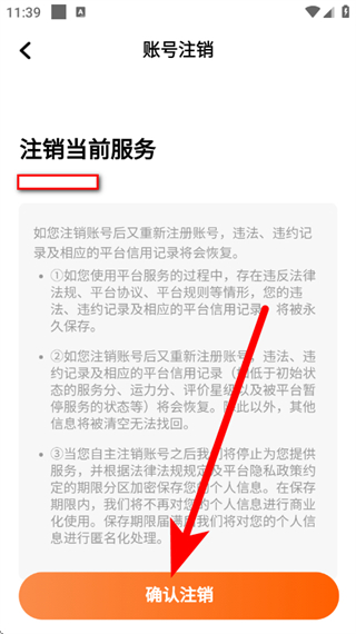 5、在账号注销页面,点击确认注销,进入账号注销页面。