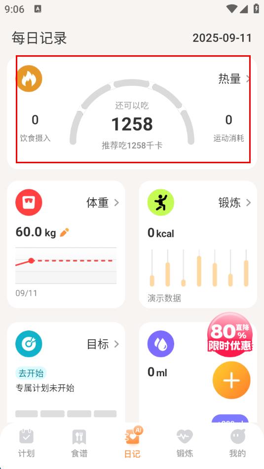 2、进入每日记录页面后,可查看热量相关记录,包括饮食摄入、推荐摄入千卡数、运动消耗等信息。