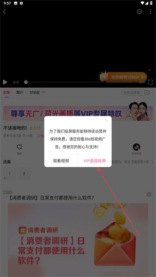 3、当界面弹出提示后,点击VIP直接投屏即可开始。