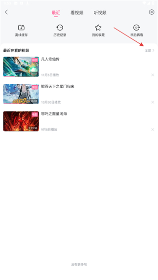 2、进入最近的界面内,点击最近观看视频右侧全部的按钮。