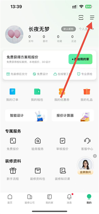 1、打开土巴兔装修app,进入我的页面,点击右上角三条横线图标。