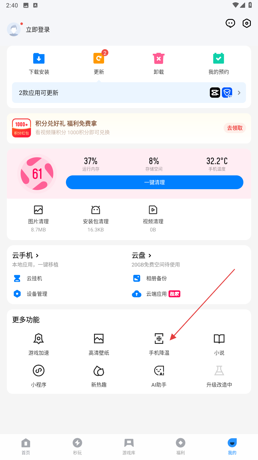 3、进入个人主页内,点击手机降温的功能按钮。