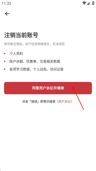 5、在注销确认页面,点击同意用户协议并继续按钮,进入验证环节。