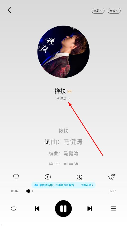 3、歌曲播放页面后,点击歌手名字,进入歌手主页。