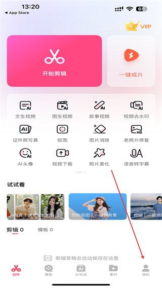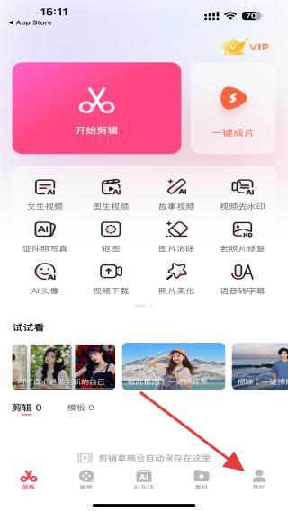 1、打开快剪辑应用,点击首页右下角我的图标。