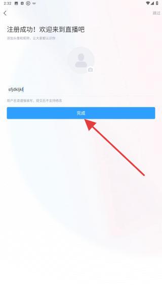3、显示注册成功,用户需要填写昵称,添加头像后点击完成即可完成全部注册流程。