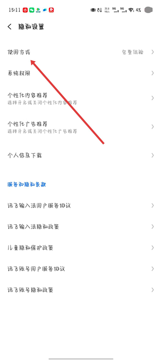3、在隐私设置页面找到使用方式选项,点击该选项进入使用方式的选择界面。