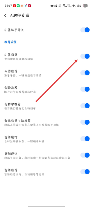 4、找到小蓝语录选项,击小蓝语录旁的开关按钮。