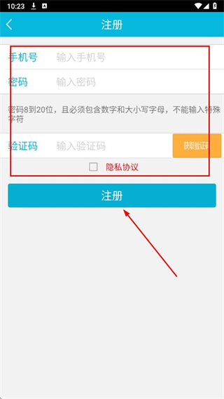 3、输入手机号、设置密码,输入验证码,勾选隐私协议,点击注册,完成账号注册。