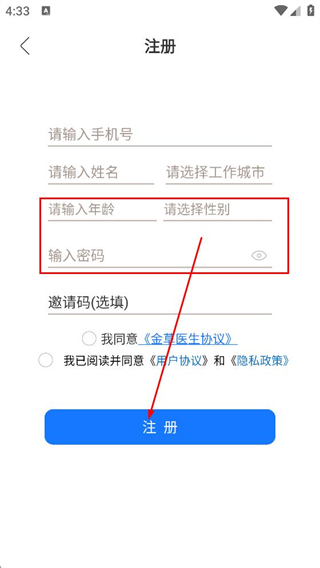 3、在注册页面,输入年龄性别,设置密码,点击注册,完成账号注册操作。