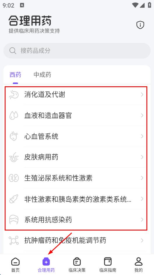 2、点击底部导航栏的合理用药,进入页面后可按西药、中成药分类,查看各系统的用药信息,辅助临床用药决策。