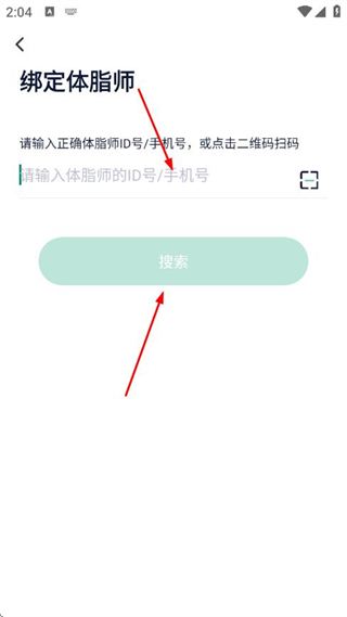 4、输入体脂师的ID号或手机号后,点击搜索,即可完成体脂管理师的绑定。