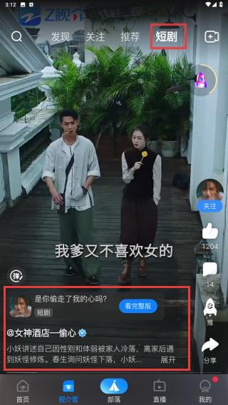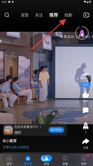 2、在推介官页面的顶部导航栏中,找到并点击短剧标签,即可进入短剧专属内容专区。