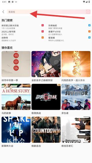 2、点击搜索框,弹出键盘后,输入想要查找的视频名称、节目名、演员/嘉宾名字等关键词。
