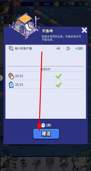3、找到已建造好的钓鱼椅,点击对应的钓鱼按钮,开启钓鱼操作,储备指定数量的鱼,推进任务进度。