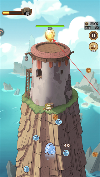 2、英雄在塔顶自动战斗,击败敌人获取金币、经验等资源,积累进度。