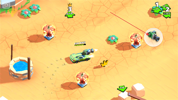 场景内分布多种功能各异的道具,涵盖助力前进、主动攻击、摧毁敌方车辆等不同类型,道具的随机刷新让每场对局都充满变数。
