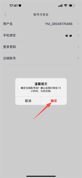 5、在温馨提示弹窗中,点击确定按钮,提交账号注销申请。
