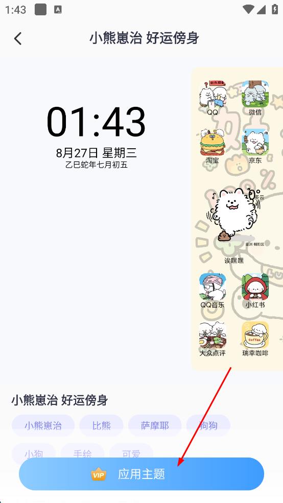 3、在主题详情页,点击“应用主题”按钮若需VIP按提示操作,等待系统完成应用,手机界面即更换为该主题。