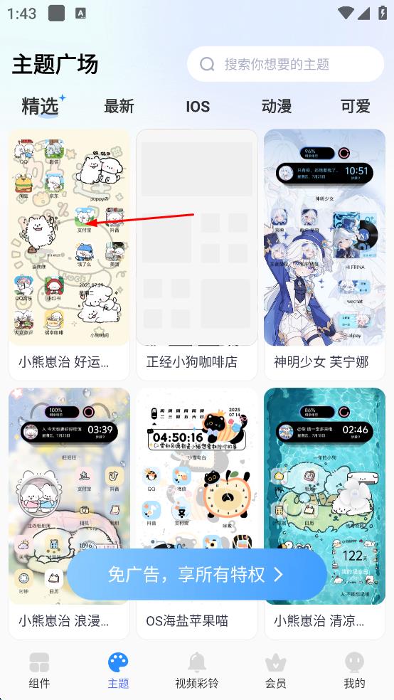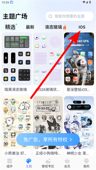 1、打开软件后,点击底部“主题”选项,进入主题广场页面,可看到精选、最新等分类的主题资源。