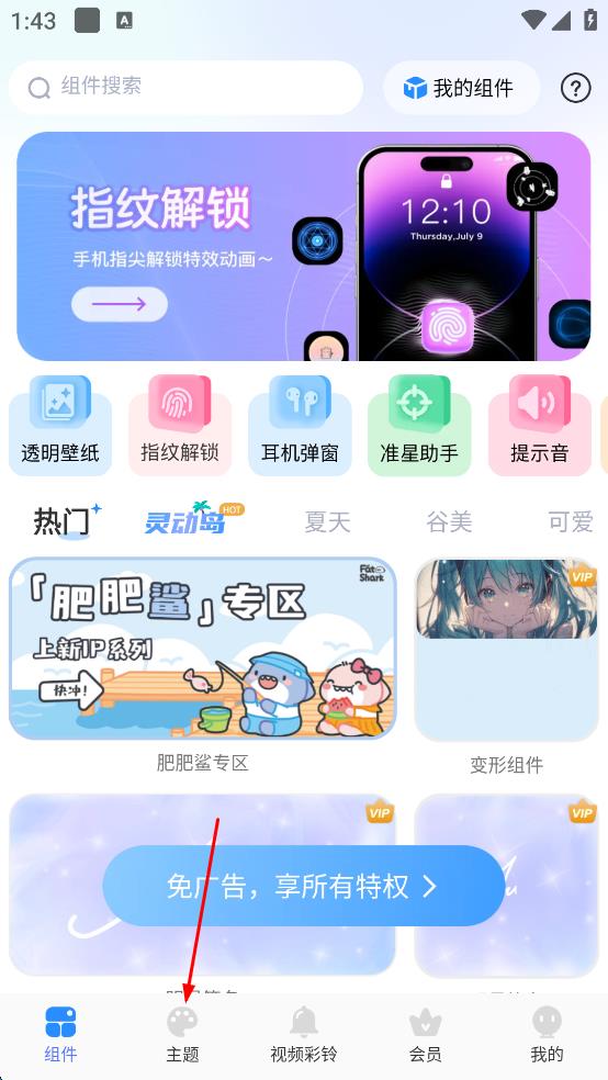 1、在应用组件页面,点击主题选项,进入主题广场页面。