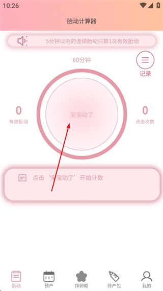 2、在胎动计算器页面,看到中间的宝宝动了按钮,点击该按钮开始记录胎动的计数操作。