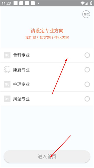 3、注册完成后,在专业方向选择页面选定对应专业,点击进入首页完成注册流程。