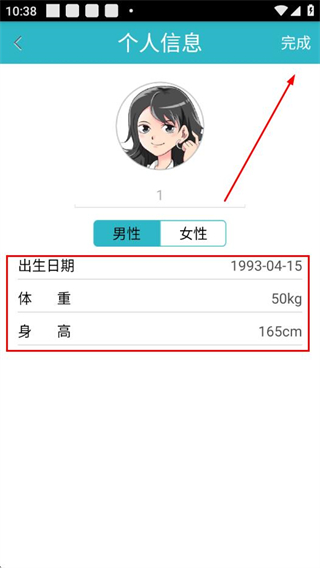 3、进入个人信息页面,完善出生日期、体重、身高等信息后,点击完成。