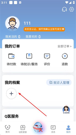 2、在个人页面的我的档案板块,点击+,进入添加就诊人页面。