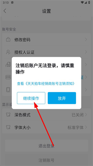 4、在弹出的提示框中,点击继续操作按钮,按后续流程完成天天拍车账号的注销。