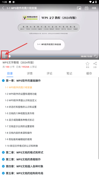 4、在课程播放页面,点击播放按钮,开始学习WPS文字教程内容。