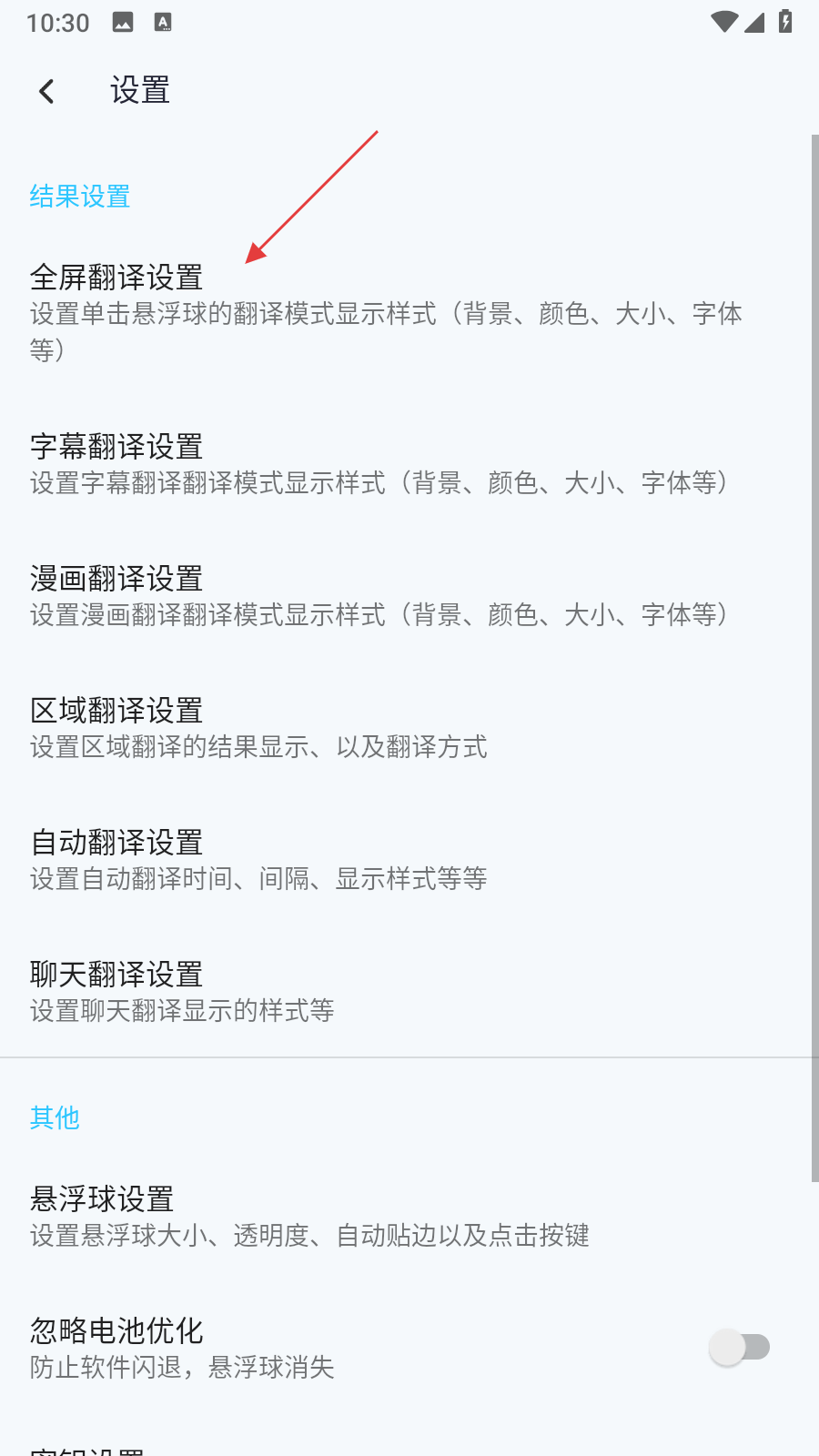 3、在设置界面里,找到全屏翻译设置,点击进入。