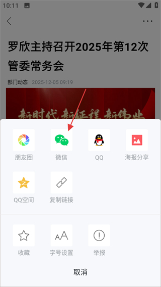 4、在分享菜单中,选择微信,即可将新闻分享到微信。