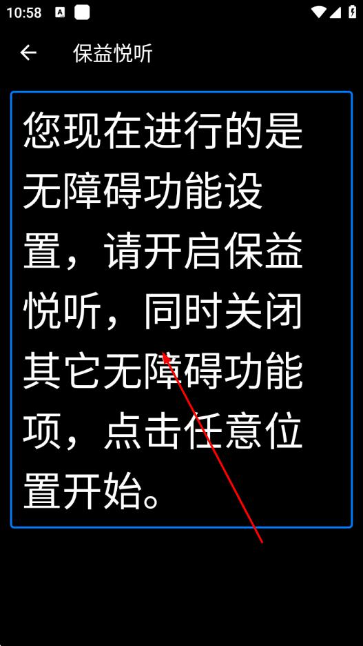 3、按照提示,开启保益悦听,并关闭其他无障碍功能项,点击屏幕任意位置开始设置。