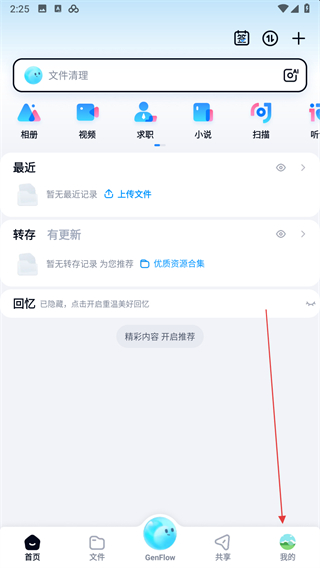1、打开百度网盘应用,进入首页后点击底部右侧的我的选项。