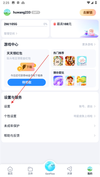 2、在个人界面中,找到并点击设置选项,找到百度网盘锁屏码,点击其右侧的开关按钮将其开启。