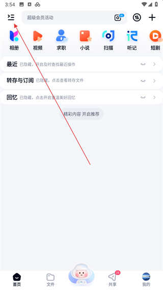 1、打开百度网盘APP,点击三条横线菜单图标。