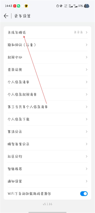 2、进入更多设置页面后,点击未成年模式选项。