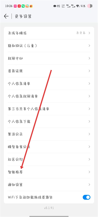 2、在更多设置页面中浏览选项,找到智能推荐选项并点击,进入智能推荐设置界面。