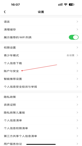 2、进入到设置的页面内,找到并点击账户与安全的功能按钮。