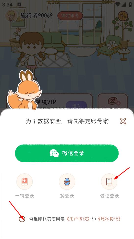 3、在提示窗口,勾选同意用户协议和隐私协议,选择“验证登录”,进入手机验证登录页面。