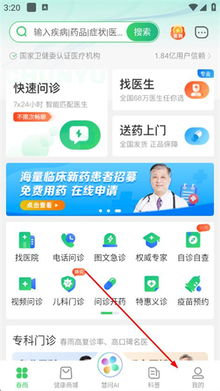 1、在春雨医生app的主页面,点击底部“我的”选项,进入个人中心页面。