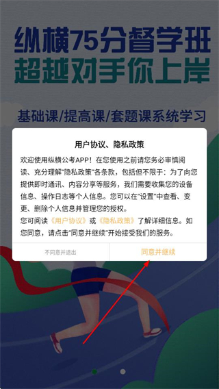 1、打开纵横公考APP,在弹出的用户协议、隐私政策界面,点击同意并继续。